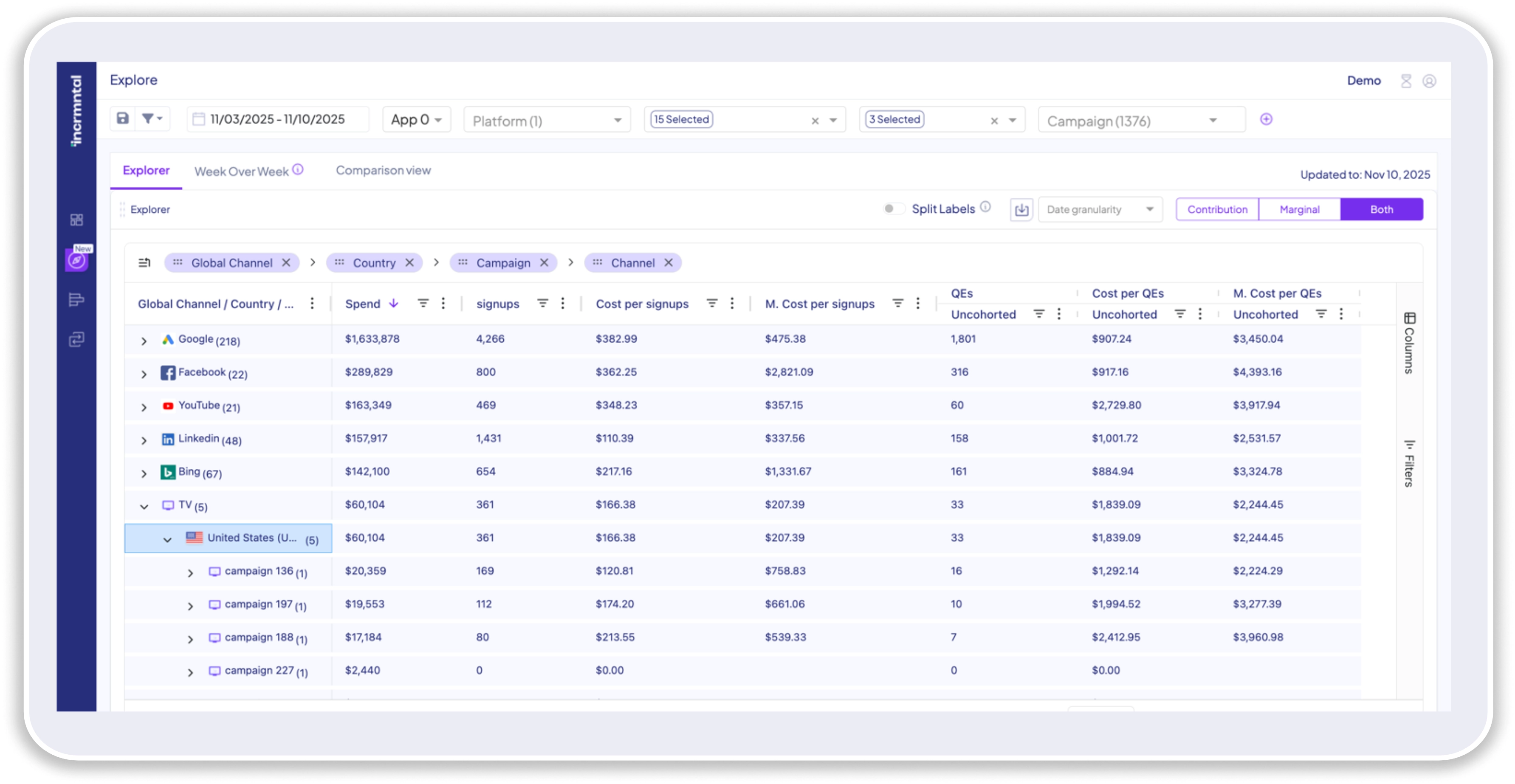 Explorer connects marketing activity across platforms and environments to incremental business outcomes. It continuously learns how value is created, updates itself as conditions change, and produces granular insights your team can use to reallocate budget confidently.