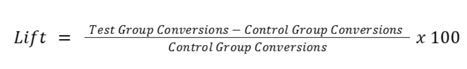 Lift is the percentage increase in conversions due to the campaign, relative to the control group. It is calculated as: