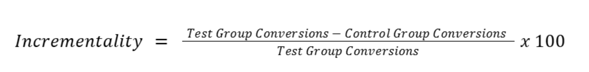 Incrementality measures the percentage of conversions that occurred only because of the marketing effort. It is calculated as: