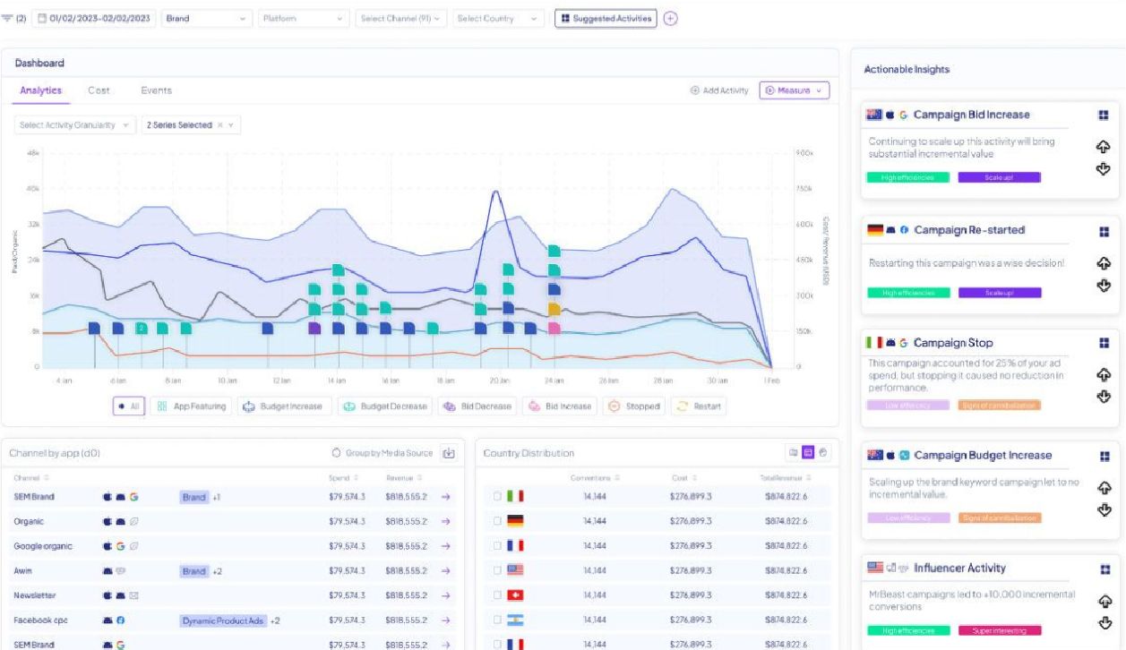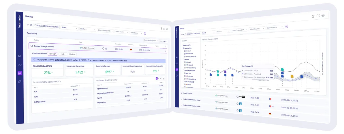 Gain a competitive edge with Actionable Insights: No more guesswork or time wasted on deciphering data – our platform takes your marketing to the next level by analyzing incrementality measurement. Shows you precisely what actions to take to boost your marketing efficiency.