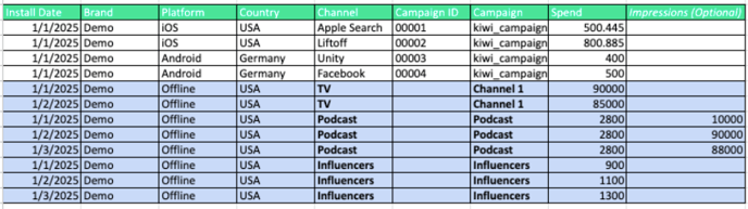 This article outlines data format options and requirements, as well as best practices for sending offline spend data to INCRMNTAL. Ensuring proper data structuring helps accurately measure the impact of offline campaigns on overall performance.