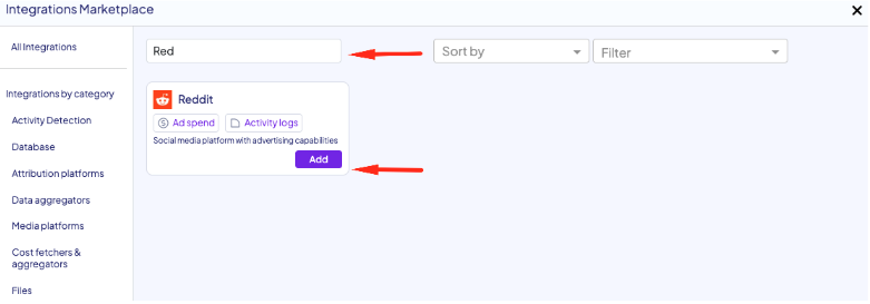 - Click the Add Integration Button and in the search bar look for Reddit, then press Add: