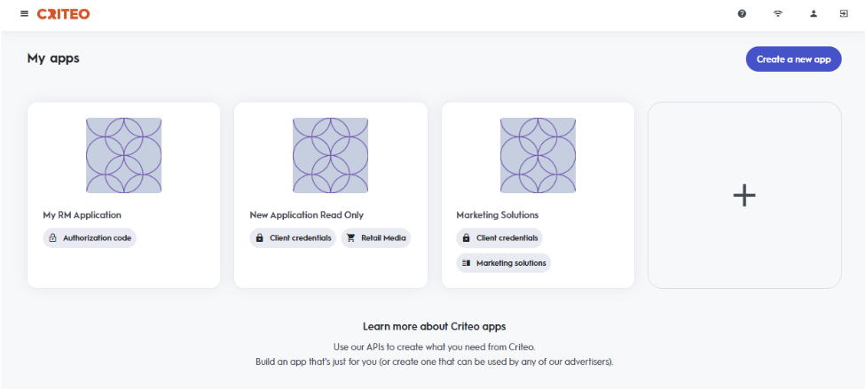- For client credential application, once you have logged in to the Criteo Partners Portal, find your application under My apps and navigate to your Application details page.