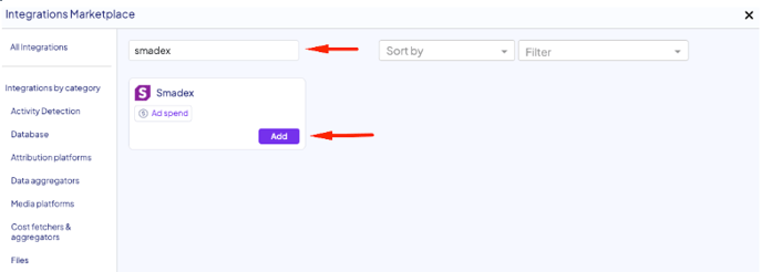 - Click "Add Integration" and in search for Smadex using the search bar. Click "Add".