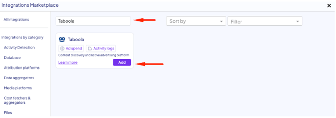 - Click the Add Integration Button and in the search bar look for Taboola, then press Add: