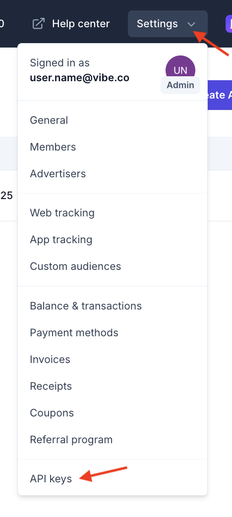 All API requests require an API token. You can generate your API key directly from your Vibe account by following these steps:
