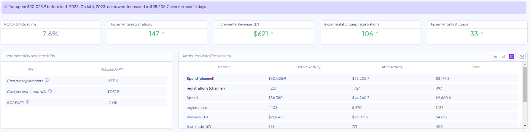 Measuring the incremental value of a channel takes only a few seconds and can be done directly through the dashboard.