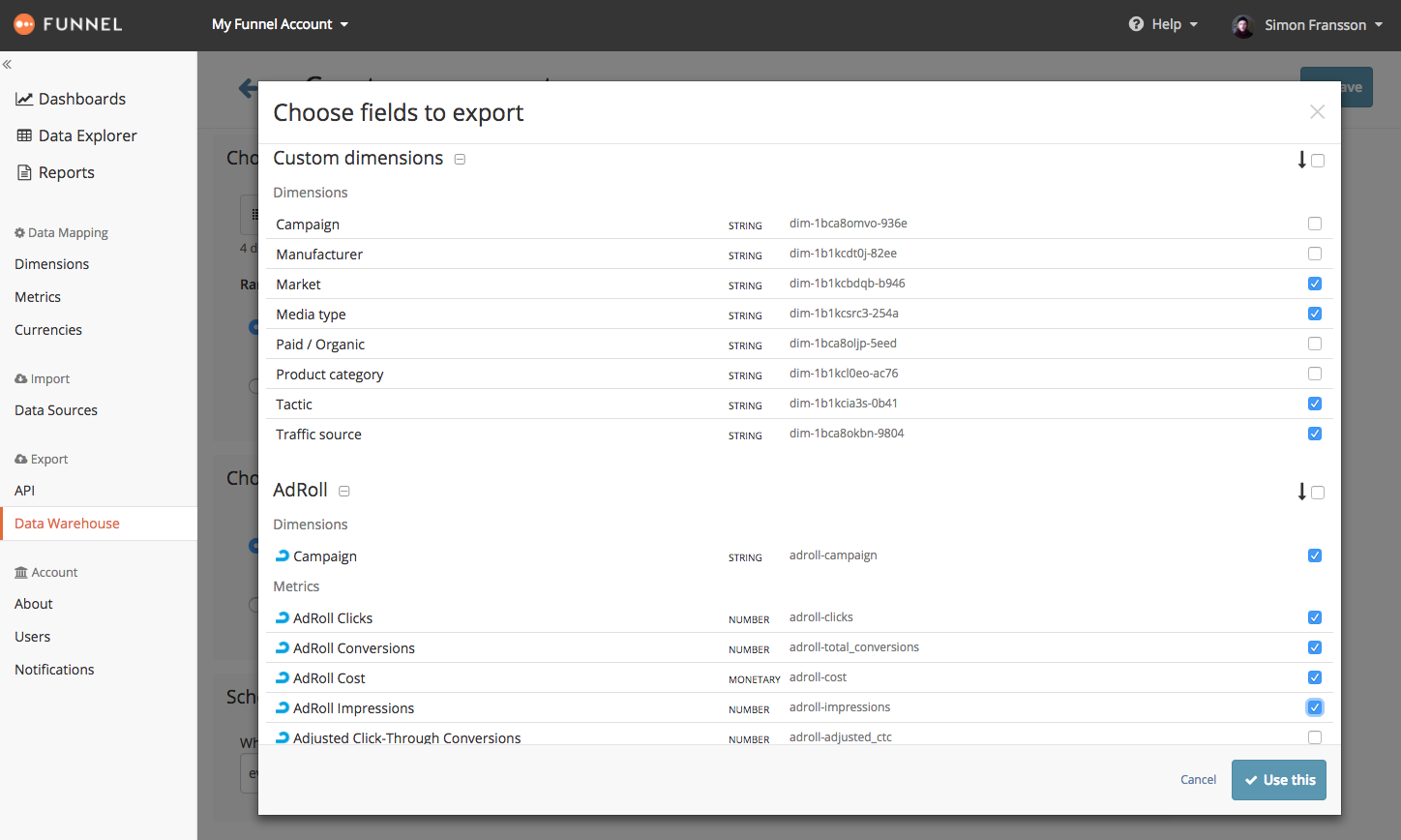 - In Funnel.io, open your Account, select "Data Warehouse" in the left hand side navigation and click the "New export" button to setup a new export.