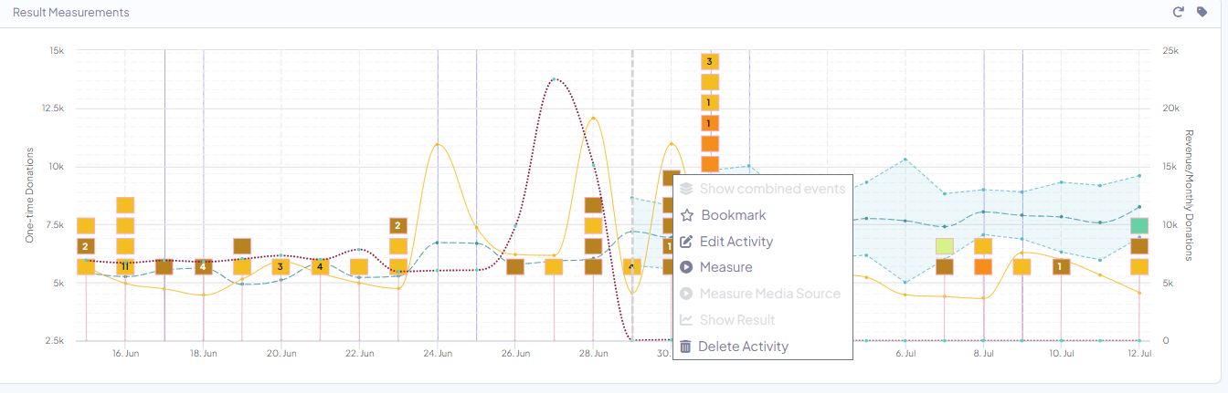 Clicking the Data Layers checkbox will allow you to overlay the graph with other significant logged marketing activities used in the measurement test, and the costs graph for the dimensions of the measured activity.