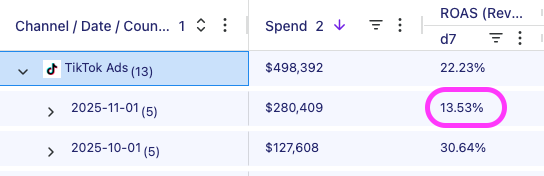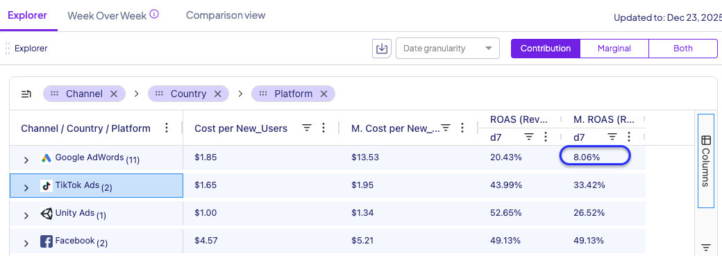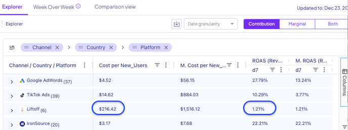 In the Contribution view, you see the total incremental value a channel or campaign delivered over time, given its full spend history. You can read more about Contribution here.