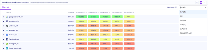 The Heatmap is presenting the total value for the entire spend of any channel, based on your applied filters. Here, we can filter to any metric or KPI we wish to view (e.g. registrations OR cost per registration).