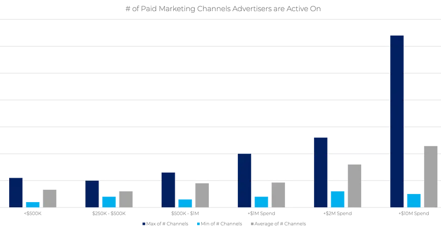 Now as you might have predicted, the larger the budget, the larger the “net” would be. Looking at our data, we have seen that there is a clear correlation between the number of channels advertisers are active with against their total ad spend.