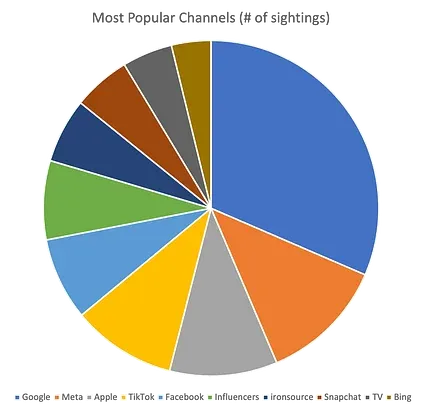before we break down the specific channels. Let’s give you a bit of background as to the “advertiser behavior” we discovered. While our client data showed that there were several “popular” channels used in their mix the ad spend did not correlate. For example, we saw several of our clients active on Apple Search Ads (ASA) and TikTok, yet the percentage of ad spend across those channels is not represented equally in comparison with Meta, where brands spend much more in terms of share of their overall budget. As you can see from the breakdown below, the current channels that take the biggest percentage of the advertising spend are the classic four: Google, Meta, Facebook and TV.