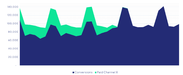 The chart below features a fictional attribution report showing total conversions, and the conversions attributed to Paid Channel X over the course of a month.