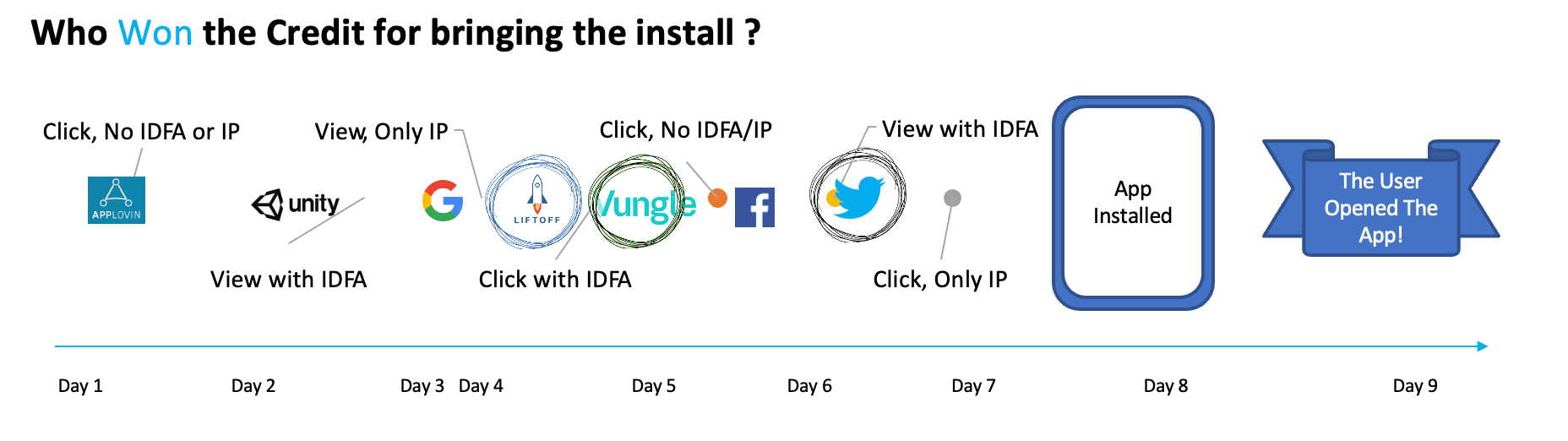 The chart below visualizes the journey of an install on an iOS device. Two of the leading mobile attribution solutions would give credit to different media vendors based on this chart, while Apple’s own SKAdNetwork would (likely) give credit to Twitter in this example.