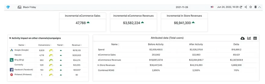 But this measurement is also showing that several of the advertising channels used by this Advertiser “enjoyed” additional sales and revenues attributed to them. These additional sales and revenues are the result of Black Friday sales, rather than a sudden improvement in the results obtained by the campaigns.