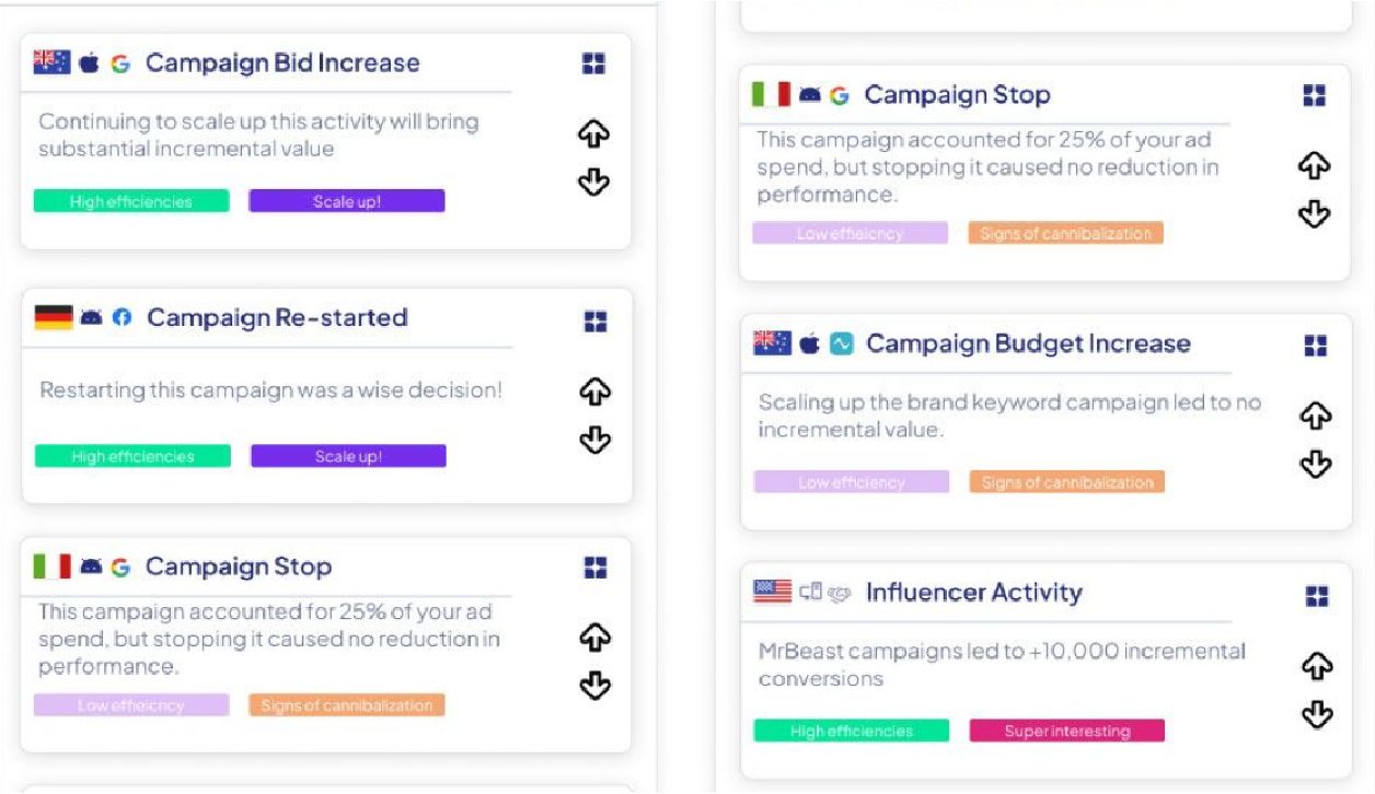 Our approach eliminates the need for any user-level data by utilizing the as advertisers shared KPIs against aggregated data. Through activity detection, it conducts micro-experiments without pausing campaigns or split audiences. The greatest advantage is that it enables you cross-platform marketing measurements for all channels and campaigns, down to the individual bid changes.