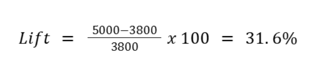 Lift is the percentage increase in conversions due to the campaign, relative to the control group. It is calculated as: