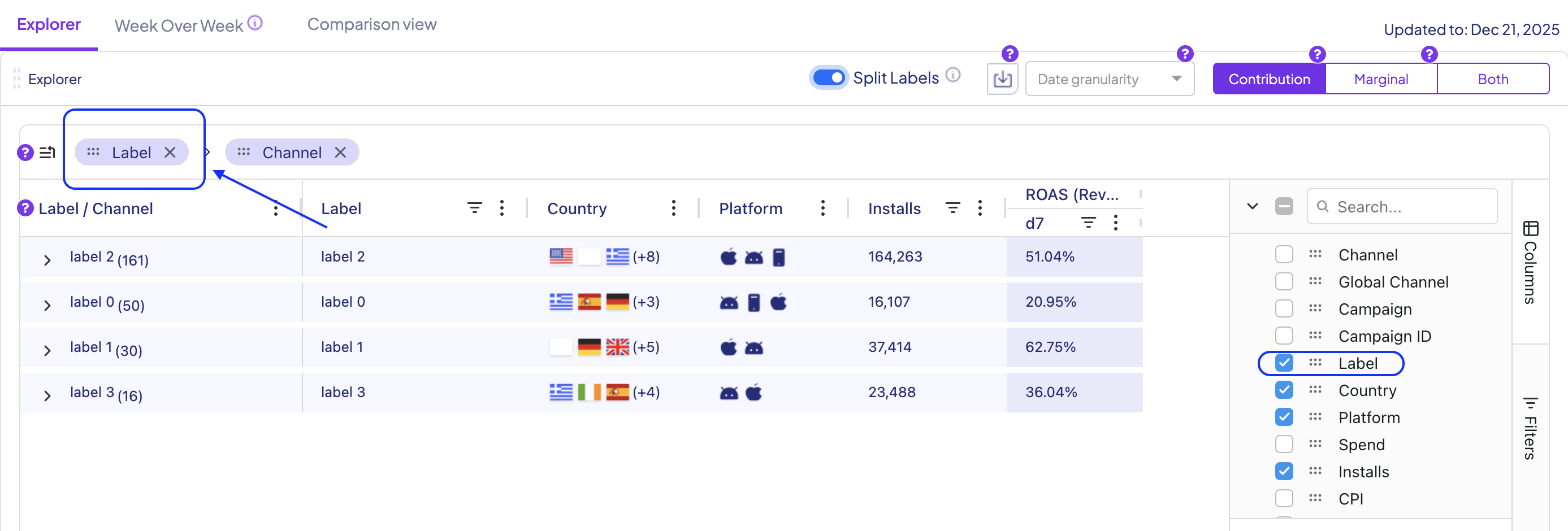 Once you have added labels to your campaigns you can analyze the performance of your labels in EXPLORER similar to how you analyze your Channel/Campaign performance.