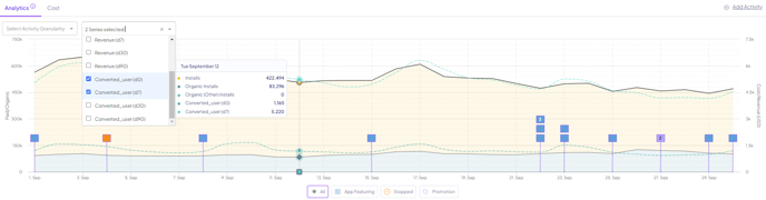 In case you wish to review more metrics, such as your revenue or engagement metric you can tick them on the dropdown within the dashboard: