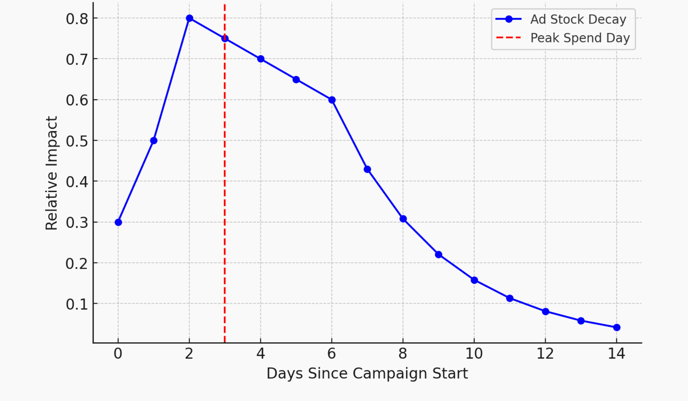 By learning from the spending unit’s ad stock in past activities – If historical data is available, use prior knowledge to model spend distribution. For example, a TV campaign may have 0.3 of its impact on the first day, then increased and then gradually decaying over the following two weeks. These ratios, once understood, could then be used as ratios for a daily spend recalculation.