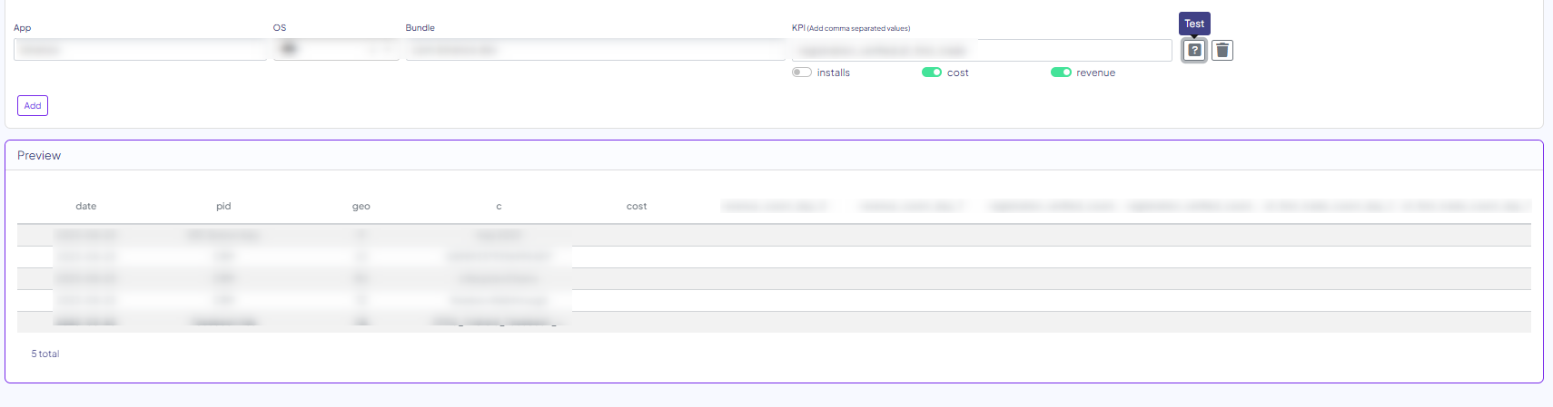 8. By clicking "Test", the platform will present to you a sample of said KPI, as fetched by us.