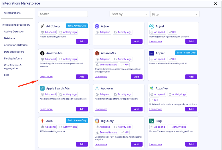 - Click the Add Integration Button and in the search bar look for Amazon Ads, then press Add