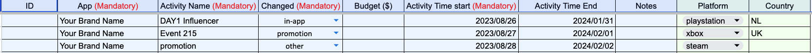 Should you have regular promotions, in-game events, or other events that impact your performance significantly, you can add them in bulk through a Google Sheet integration.