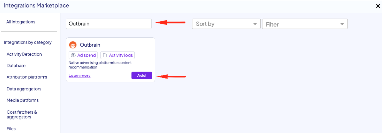 - Click the Add Integration Button and in the search bar look for Outbrain, then press Add: