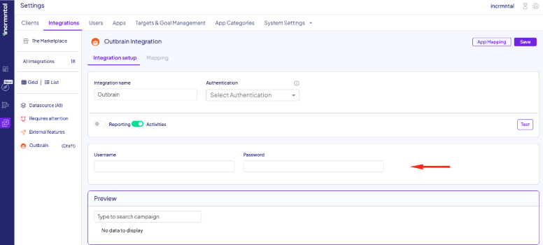 - Enter your Outbrain credentials and then click ‘Test’, once your account is authenticated you will be able to see your campaigns in the ‘Preview’ section