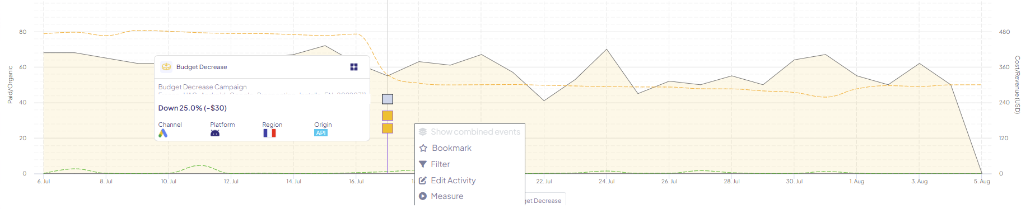 6. Here, we can see a decrease in spend (the orange dotted line) of a specific campaign in Google. To measure it, all we need to do is click the activity and select "Measure"!