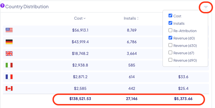 2. Scroll down to the Country Distribution table and tick your KPIs and Spend