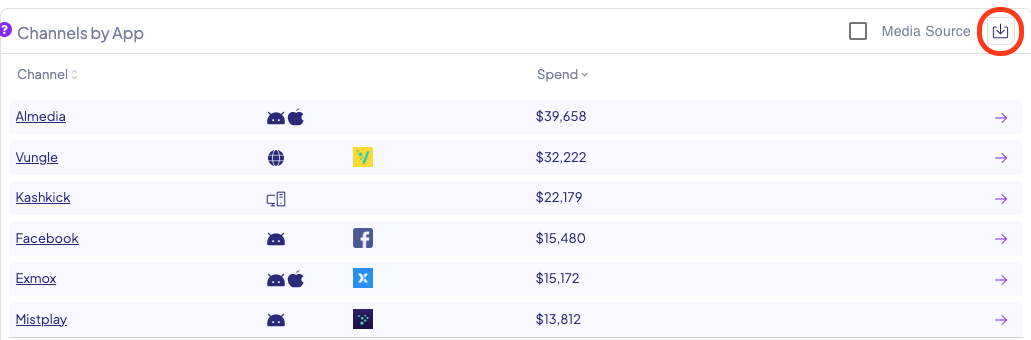 - You can check and download Spend per Networks through the main UI by clicking the Export button in the top right corner of the Channels by App table. This will export the data based on the applied filters on the board.