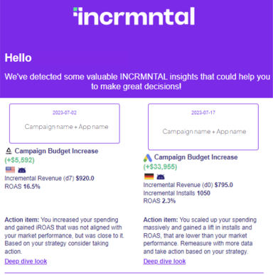 Our platform is able to automatically measure and report the incremental value gained (or lost), given significant changes in your spend, app featuring, or manually added changes to the platform.. We've worked on an automated, curated process, where the platform automatically measures significant changes detected on your board, and our Analyst team chooses, reviews, and curates the highlights that are being sent to you, to ensure their compatibility to your current strategy and goal.