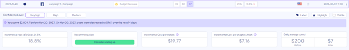 For instance, when creating a ROAS goal, the platform will utilize the defined benchmarks and will create the recommendations according to this goal, and the incrementality showing for your ROAS within each result.