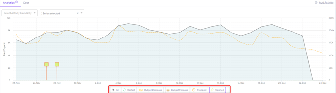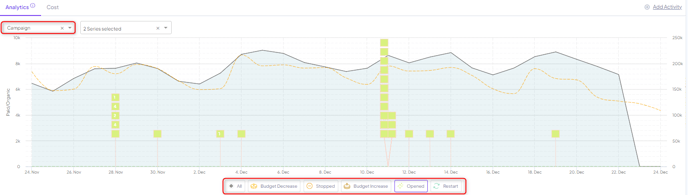 ) , you’ll be able to filter activities on the board based on the activity and the size of change (based on % of change or amount of spend). Don’t forget to click ‘apply’ once set to filter the dashboard!