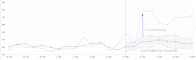 - The prediction is wrapped with a 95% confidence interval (by default), and what we attribute as the incremental impact are the points where the actual (factual) goes beyond the prediction confidence interval range