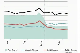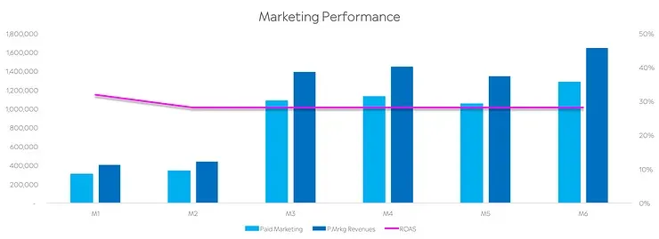 The graph below shows ROAS vs. marketing spend and conversions attributed to paid marketing.