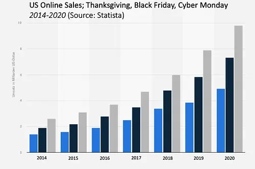 Black Friday (25th of November) and Cyber Monday (28th of November) represent the biggest shopping days in the US. Consumers spend has risen to +$14bn across the Thanksgiving weekend shopping spree. None of this is news.