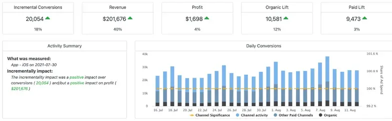 In another case study, a customer found that getting featured within their app category, did create lift – however, as many of their paid media campaigns were using Cost Per Install pricing – much of the value was taken away from organic results to paid channels. In this case study, the customer saw incrementality for conversions and revenues, but the incrementality over profit was limited due to the increase in spend.