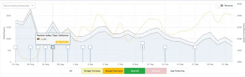 We integrated an API process that collects all app featuring, including the type of the featuring and the country where the app was featured. We visualize this on our dashboard as an “activity” – allowing Advertisers to measure the impact of their app getting featured – but as importantly – allowing incrementality measurement to take the app getting featured as a consideration when calculating what is the incremental value of a channel, campaign, or any specific activity (such as budget increase, decrease, or bid changes).