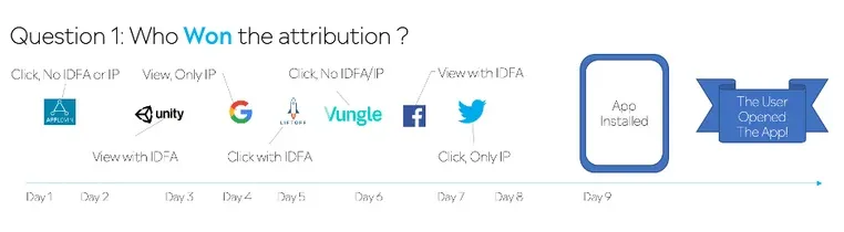 Mobile Attribution today works using “Last Touch Point”. It’s the only way, as the mobile app eco-system is guarded by the operating systems walled gardens.